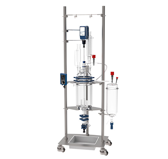 В стандартный комплект поставки входит напольная мобильная рама из нержавеющей стали (колеса с стопперами), емкость c рубашкой и донным сливом (с нулевым мертвым объемом), крышка с лабораторными шлифами (стекло/ сталь/ фторопласт), верхнеприводная мешалка, герметичный затвор, компенсатор осевого биения, перемешивающий элемент из фторопласта, а также стеклянные аксессуары, такие как капельная воронка, обратный холодильник, адаптеры для подачи газа/вакуума, система дистилляции и пр.